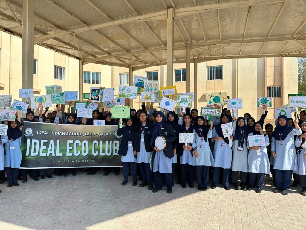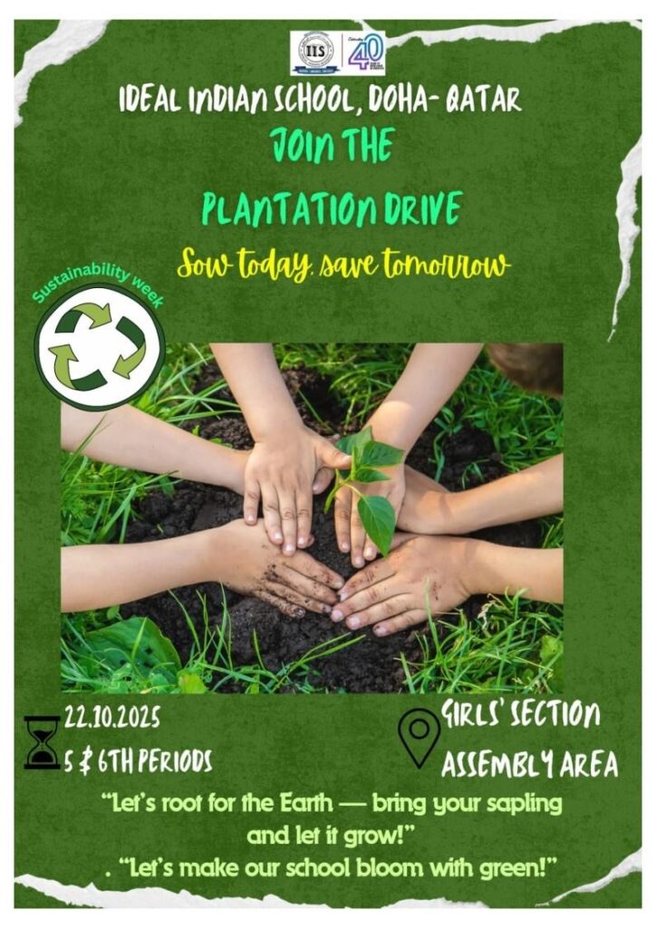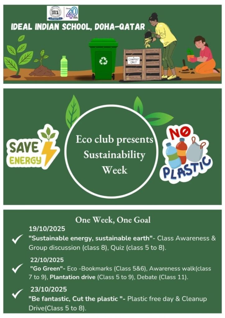 The Department of Science and the Eco Club of the Girls’ Section of Ideal Indian School, Doha, Qatar, jointly organized Sustainability Week 2025 on 19th, 22th and 23rd October 2025. The event was conducted under the themes “Sustainable Energy, Sustainable Earth,” “Go Green,” and “Be Fantastic: Cut the Plastic.” The celebration aimed to foster environmental awareness, promote energy and water conservation, and encourage students to adopt sustainable habits in their daily lives.