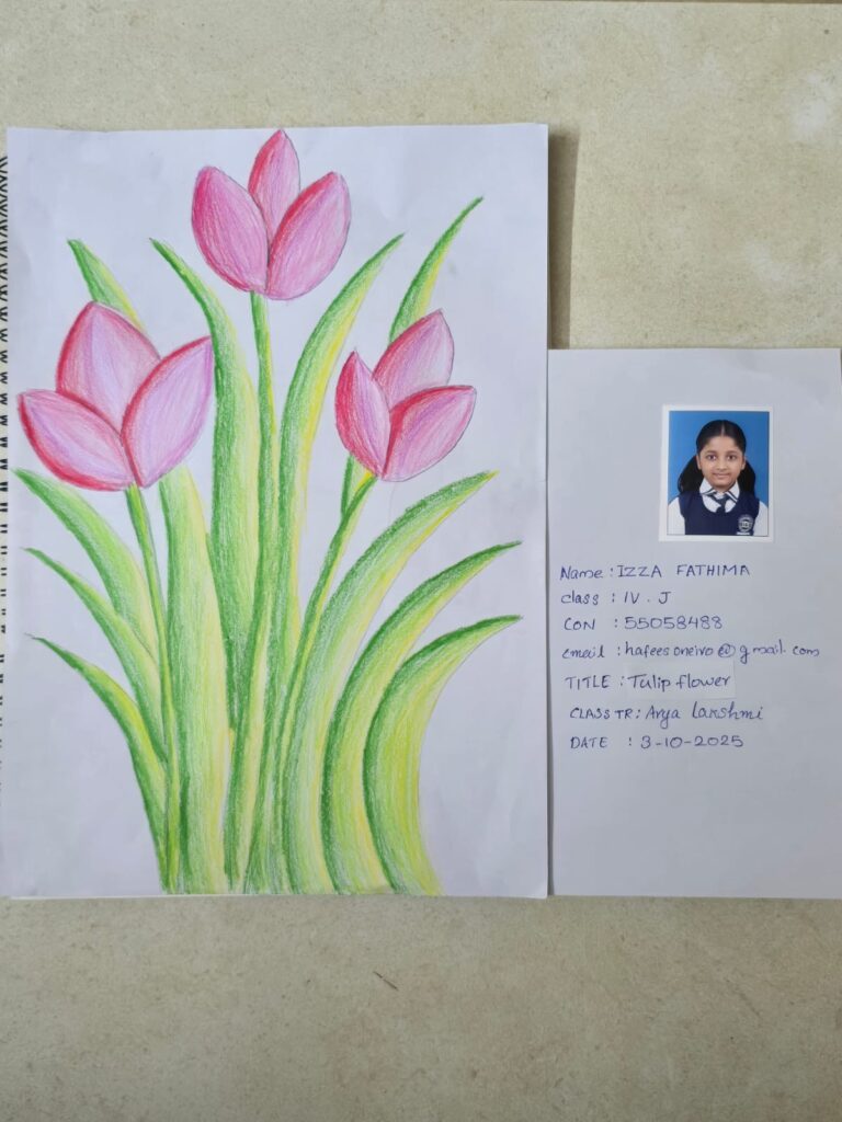 A tulip is a bright, cup-shaped flower that grows from a bulb. It usually has smooth petals, a long green stem, and simple leaves. Tulips come in many colours such as red, yellow, pink, purple, and white. They are popular spring flowers known for their elegant shape and vibrant beauty.