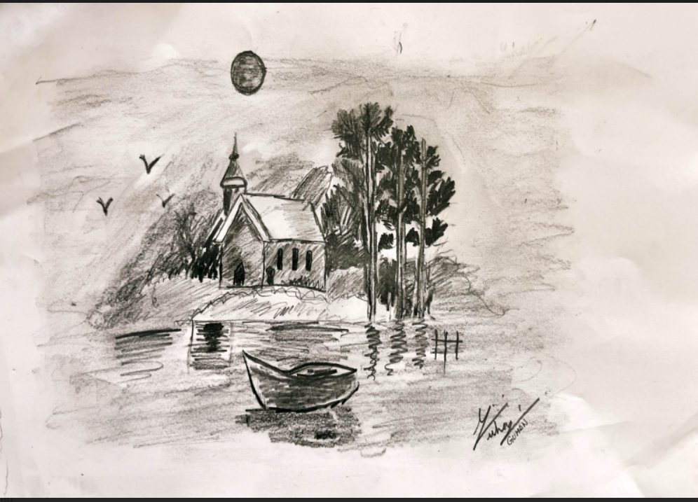 This artwork made by Guhan Gnanakumar of class 5 D is truly impressive and shows remarkable skill. The artist has beautifully used shades of black and grey to create a peaceful and artistic scene. The church, the tall trees, the still water, and the small boat are all drawn with great attention to detail. The reflections in the water and the birds in the sky add a calm and realistic touch.